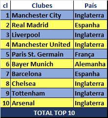 • A Premier League, além de abrigar o time com maior faturamento, é o campeonato com mais clubes entre os TOP 10 (seis). Em segundo aparece a La Liga (Espanha) com duas equipes. Completam a relação com um time cada: Bundesliga (Alemanha) e Ligue 1 (França).