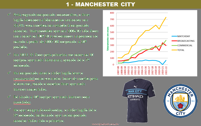 • Sobre o Manchester City, deve ser ressaltado que em 2006-07 o clube não ficou nem entre os TOP 20 e só começou a aparecer no estudo a partir de 2007-08 ocupando a 20ª posição. Apenas em 2011-12 ficou pela primeira vez entre as 10 equipes que mais faturaram, quando foi o 7º colocado.
