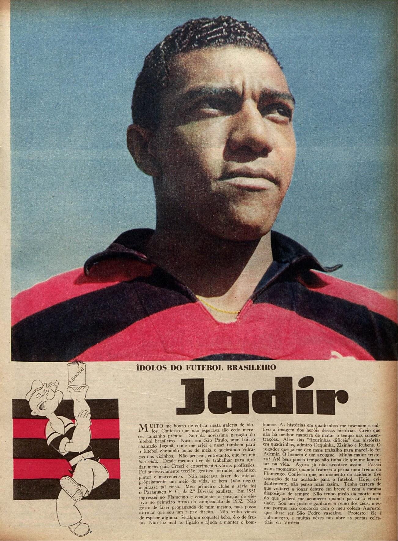 Meu filho mais velho, hoje um homem com seu respeitável um quarto de século de vida, tinha somente oito anos e jogava botão comigo. Do nada, simplesmente do nada, virou-se para mim e perguntou quem foi o Dequinha. Foi ali que comecei a juntar tudo sobre a história dos ídolos do futebol. O que hoje leem do que escrevo sobre eles brotou ali, naquela pergunta do meu filho. E o Jadir? Bem, o Jadir, hoje, dia 9 de abril de 2020, faria 90 anos. Jadir Egídio de Souza, um dos ídolos do meu tio Leônidas. E pensar que o Jadir morava na rua Ataulfo de Paiva, no Leblon, onde também morei até meus nove anos de idade. Éramos (quase) vizinhos. Talvez nem meu tio e nem meu pai soubessem disso. Talvez eu tenha cruzado com o Jadir no caminho até a padaria do seu Carlos ou a banca de jornal, na esquina da rua Rainha Guilhermina com a Ataulfo, sem me dar conta de que ali estava o Jadir, um ídolo do Flamengo. Ou mesmo tenha esbarrado no Jadir, no bar Jobi, se identificá-lo.