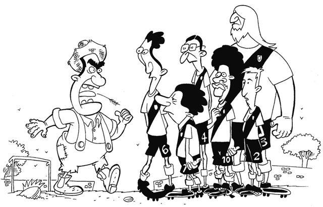 – Meio de campo não pode enrolar, tem que distribuir a bola igual a rabo de vaca: prum lado e pro outro!