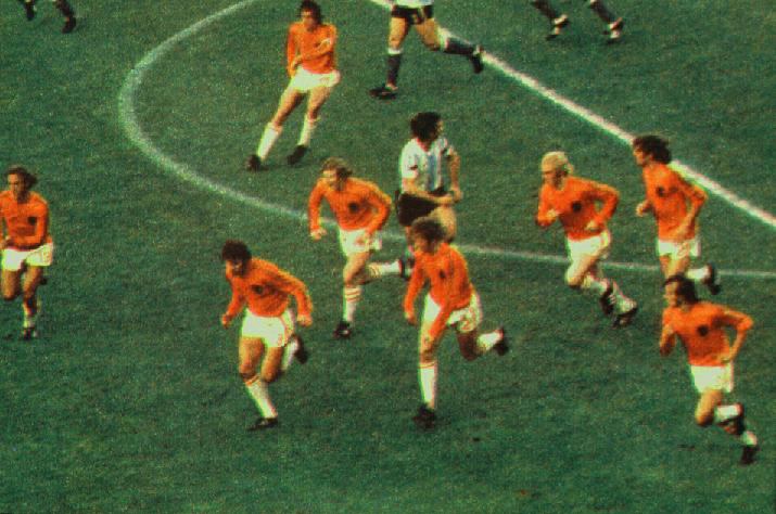 O confronto da Holanda contra o Uruguai na Copa de 1974 deu a sensação de que os caras de laranja eram de outro planeta. Pela TV dava a sensação de que aquilo tudo era armação, efeitos especiais, mas não era, era futebol puro, completo, coisa de quem sabe das coisas, e muito. Era o jogo que ficaria conhecido como FUTEBOL TOTAL. O que muita gente não sabe, é que aquela formação de time, uma mistura do Ajax com o Feyenoord, nunca havia jogado junto, entraram cinco novos jogadores na estreia da Copa de 1974.