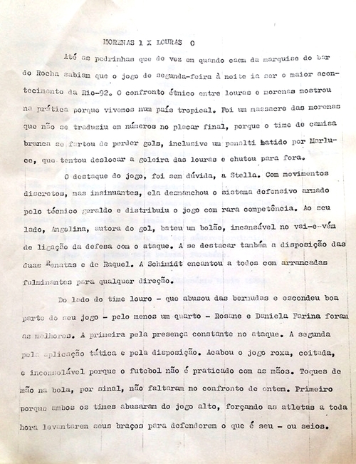 A substituição aconteceu naturalmente. Tensão e nervosismo, um clima de briga estava se instaurando na partida, então o técnico foi ágil: “Ei, gurias, elas estão só batendo. Façamos o seguinte, se soltem, troquem passes, façam 2-1 e deixem elas correrem atrás da bola, vamos cansar elas”.