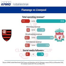 O quadro abaixo, produzido pela KPMG, compara os dados relativos à temporada 2017/18 do Liverpool contra os do clube brasileiro em 2018, nele é possível ver que a receita do time inglês é quase cinco vezes maior. Detalhando a composição desses números, veremos que o faturamento do campeão mundial com matchday (bilheteria) é quase quatro vezes superior, com commercial(patrocínios e licenciamentos) beira o quíntuplo e com broadcasting (direitos de transmissão), que é a maior fonte de receita de ambos, é mais do que cinco vezes maior. Ressalte-se que o clube brasileiro tinha na época da apuração o segundo maior faturamento de seu país, enquanto o Liverpool não figurava entre os três principais da Inglaterra, isso significa dizer que, se compararmos as médias dos clubes que fazem parte da primeira divisão dos dois países, a diferença é ainda mais alarmante.